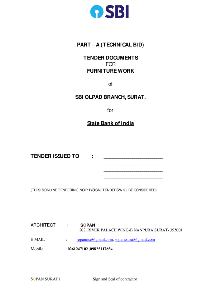 PART A (TECHNICAL BID) TENDER DOCUMENTS FOR FURNITURE WORK of SBI OLP AD BRANCH, SURAT. For State Bank of IndiaTENDER ISSUED TO:___ ___ ___ ___(THIS IS ONLINE TENDERING. NO PHYSICAL TENDERS WILL BE