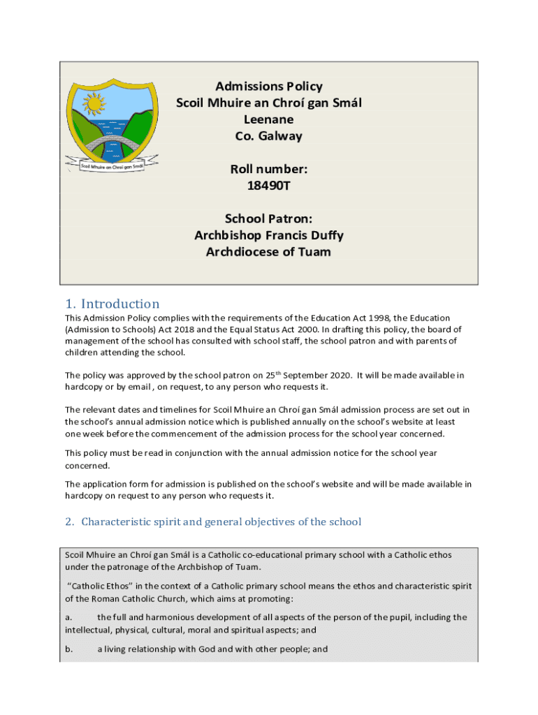 Admissions Policy Soil Choose a CCRO an SML Teenage Co. Galway Roll number: 18490T School Patron: Archbishop Francis Duffy Archdiocese of Tuam1. Introduction This Admission Policy complies with the