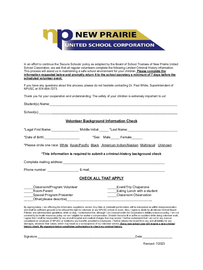 A culture of excellence In an effort to continue the Secure Schools policy as adopted by the Board of School Trustees of New Prairie United School Corporation, we ask that all regular volunteers complete