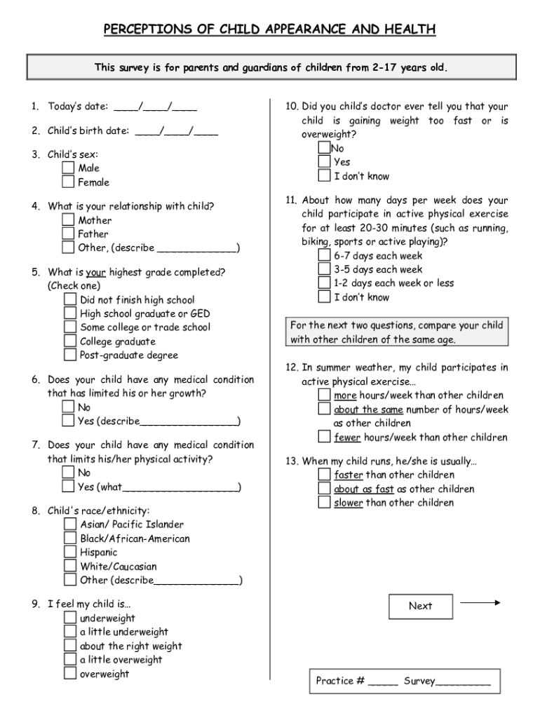 PERCEPTIONS OF CHILD APPEARANCE AND HEALTH This survey is for parents and guardians of children from 217 years old. 1. Today's date: ___/___/___ 2. Child's birthdate: ___/___/___ 3. Child's' sex: