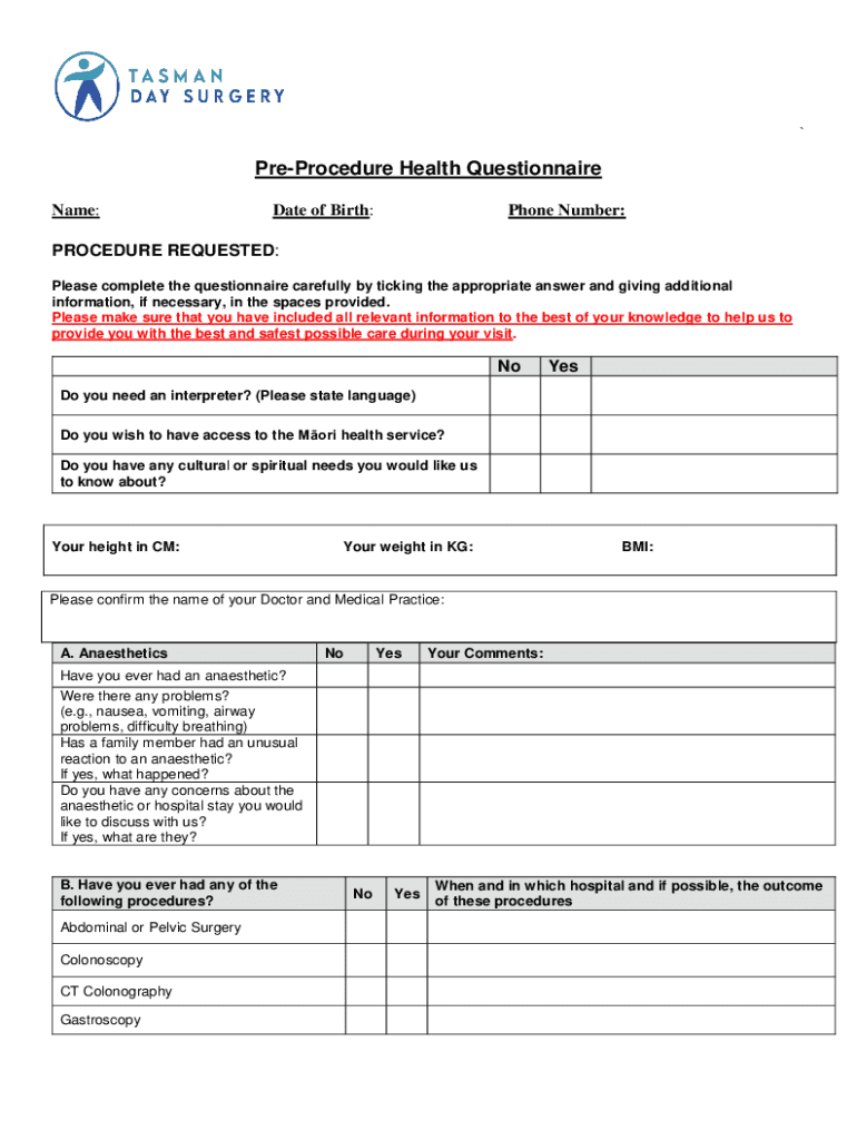 Get the free Pre-Procedure Health Questionnaire Online Form