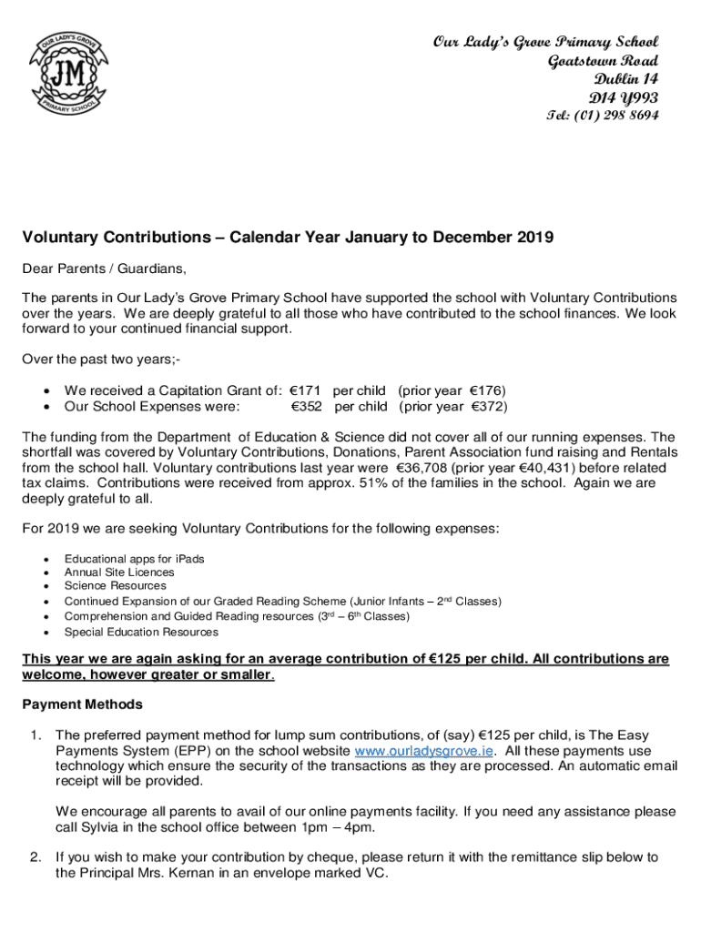 Our Lady's Grove Primary School Goats town Road Dublin 14 D14 Y993 Tel: (01) 298 8694Voluntary Contributions Calendar Year January to December 2019 Dear Parents / Guardians, The parents in Our Lady's