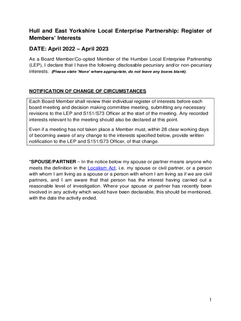 Hull and East Yorkshire Local Enterprise Partnership: Register of Members Interests DATE: April 2022 April 2023 As a Board Member/Cooped Member of the Humber Local Enterprise Partnership (LEP), I