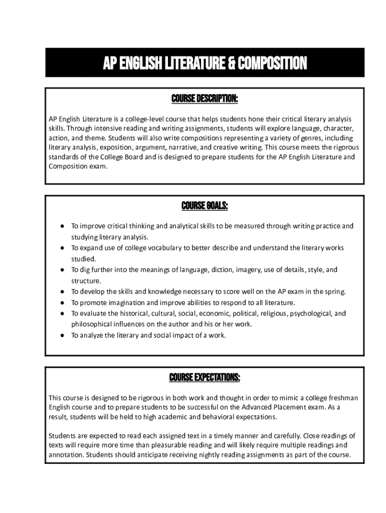 AP English Literature & Composition Course Description: AP English Literature is a college level course that helps students hone their critical literary analysis skills. Through intensive reading