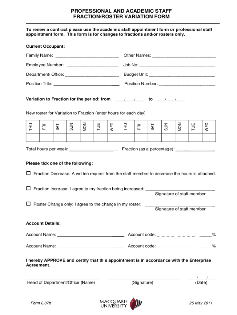 Get the free professional and academic staff fraction/roster variation form - hr mq edu
