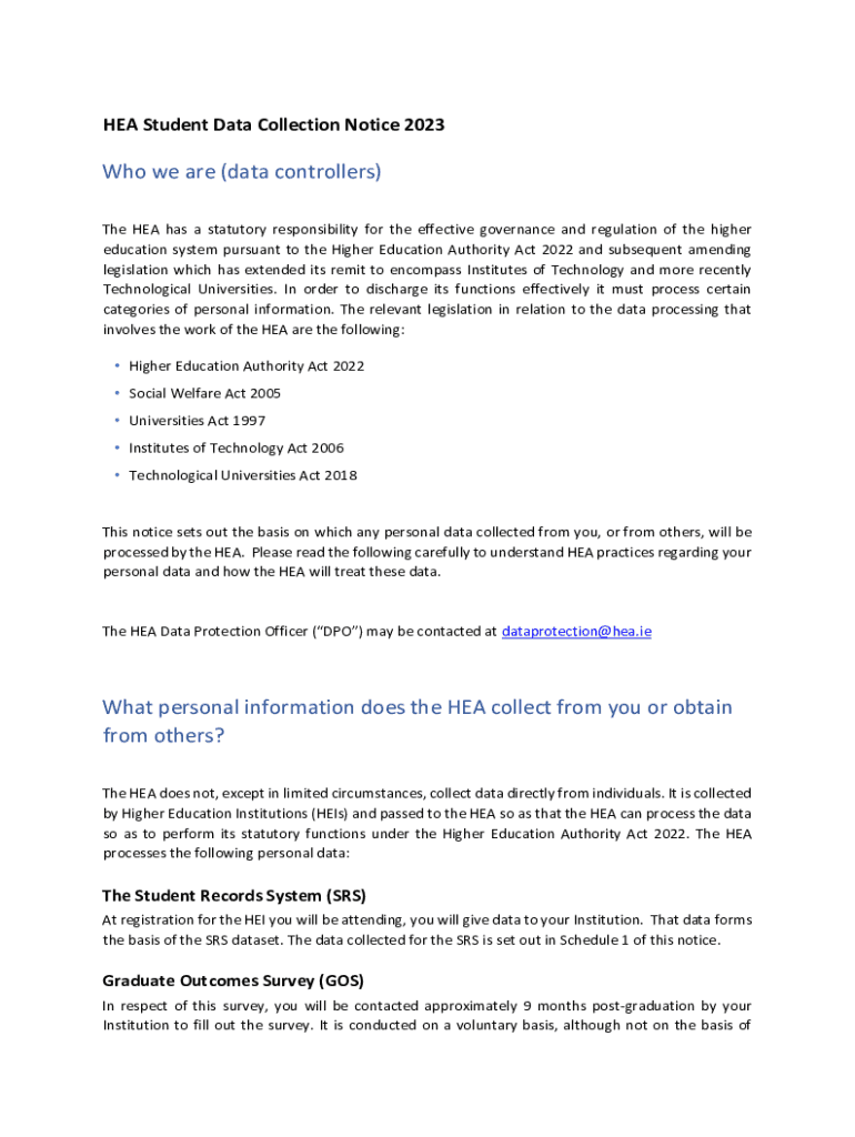 HE Student Data Collection Notice 2023Who we are (data controllers) The HE has a statutory responsibility for the effective governance and regulation of the higher education system pursuant to the