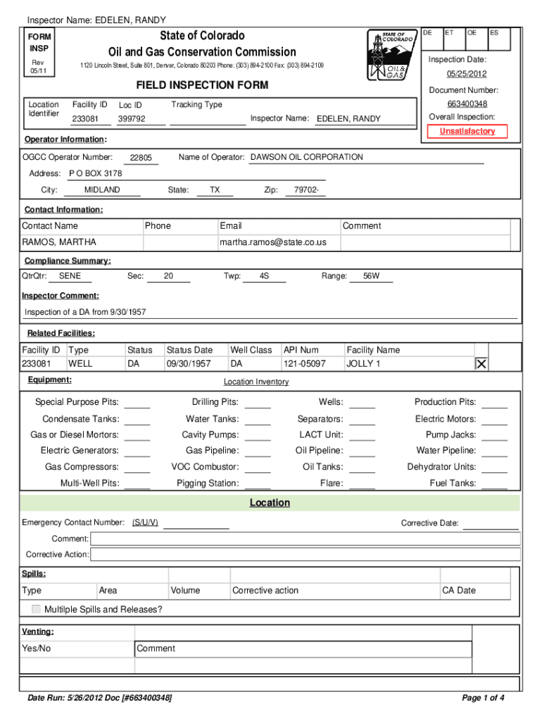 Inspector Name: ELEVEN, RANDY FORM Instate of Colorado Oil and Gas Conservation Commission Rev 05/111120 Lincoln Street, Suite 801, Denver, Colorado 80203 Phone: (303) 8942100 Fax: (303) 8942109DEETOEESInspection