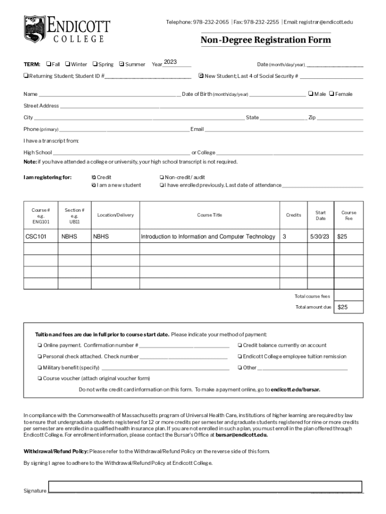 Telephone: 9782322065 | Fax: 9782322255 | Email: registrar@endicott.eduNonDegree Registration Form TERM:o Fall o Winter o Spring o Summer 2023 Year___Date (month/day/year)___ o Returning Student;