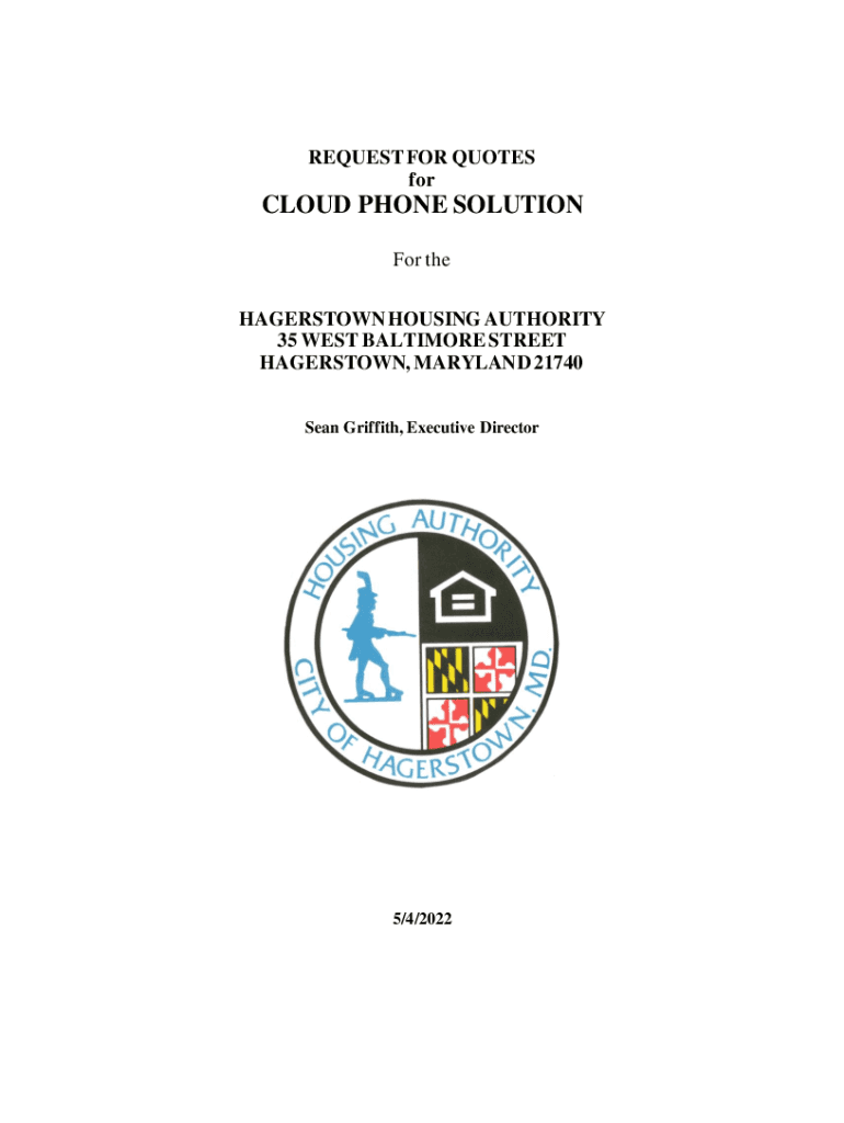 REQUEST FOR QUOTES forced PHONE SOLUTION For the HAGERSTOWN HOUSING AUTHORITY 35 WEST BALTIMORE STREET HAGERSTOWN, MARYLAND 21740 Sean Griffith, Executive Director5/4/2022TABLE OF CONTENTS Request
