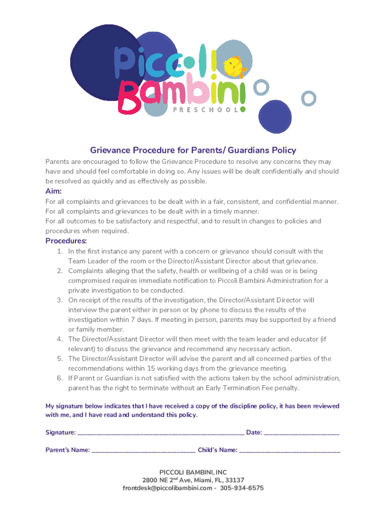Grievance Procedure for Parents/ Guardians Policy Parents are encouraged to follow the Grievance Procedure to resolve any concerns they may have and should feel comfortable in doing so. Any issues