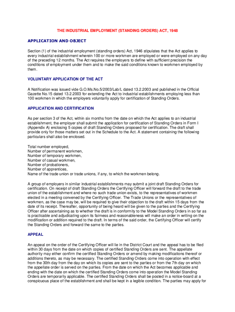 THE INDUSTRIAL EMPLOYMENT (STANDING ORDERS) ACT, 1948 APPLICATION AND OBJECT Section (1) of the industrial employment (standing orders) Act, 1946 stipulates that the Act applies to every industrial