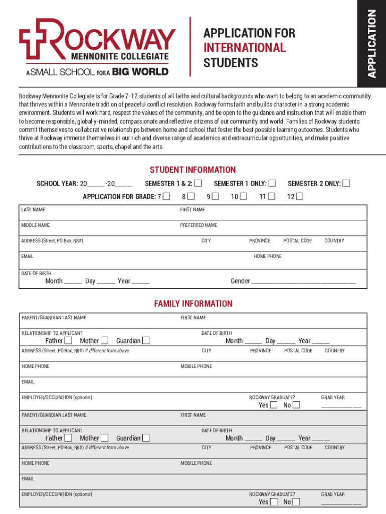 APPLICATIONAPPLICATION FOR INTERNATIONAL STUDENTSRockway Mennonite Collegiate is for Grade 712 students of all faiths and cultural backgrounds who want to belong to an academic community that thrives