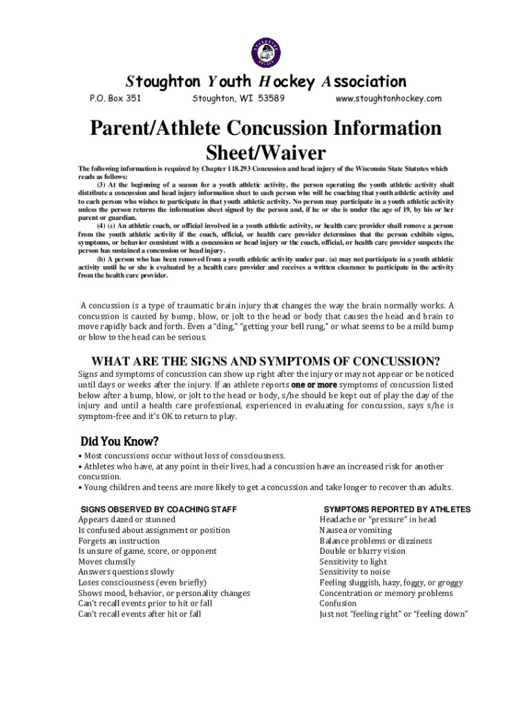 Stoughton Youth Hockey Association P.O. Box 351Stoughton, WI 53589www.stoughtonhockey.comParent/Athlete Concussion Information Sheet/Waiver The following information is required by Chapter 118.293