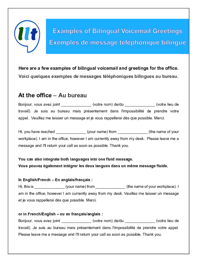 Here are a few examples of bilingual voicemail and greetings for the office. Voice queues examples DE messages techniques bilingual AU bureau. At the office Au bureau Bonjour, vows ave joint ___ (vote