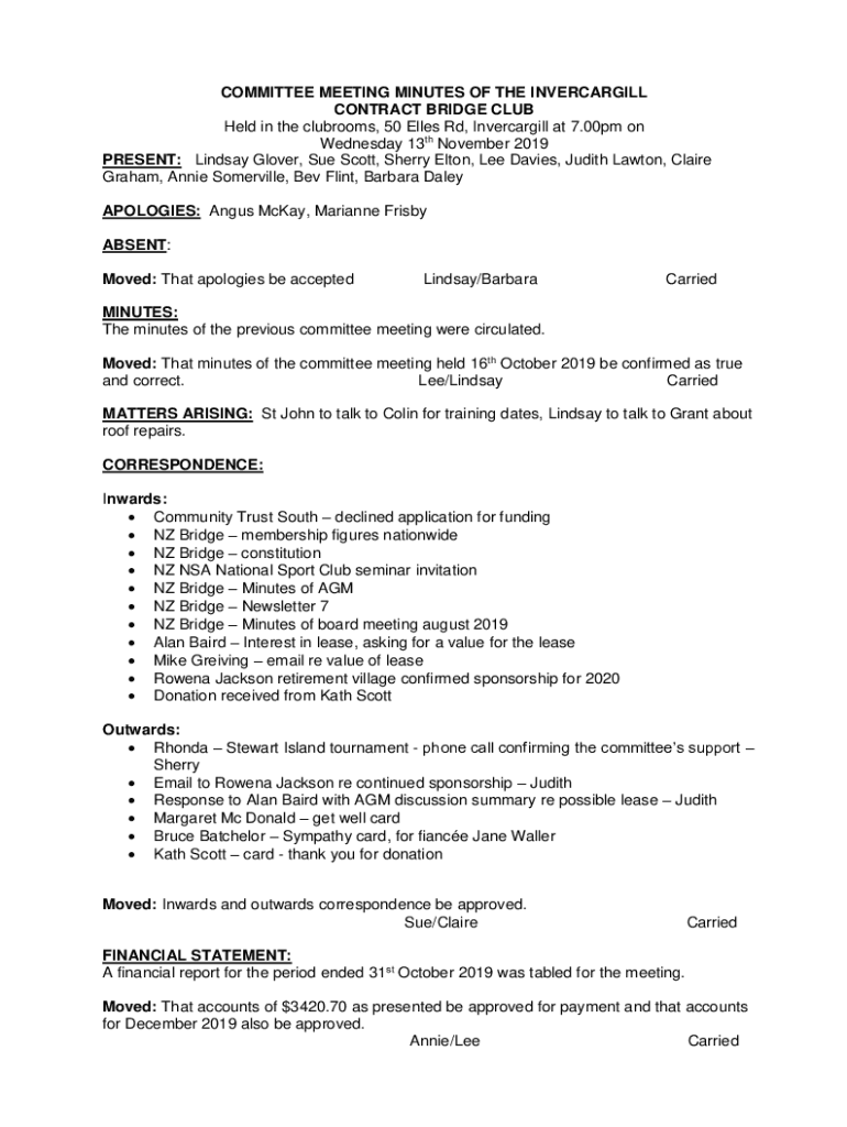 COMMITTEE MEETING MINUTES OF THE INVERCARGILL