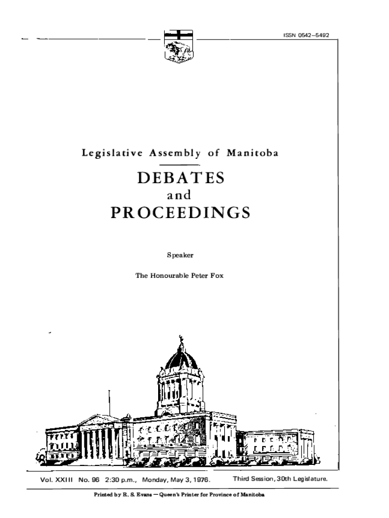 andPROCEEDINGSSpeakerThe Honorable Peter Fool. XXIII No. 962:30p.m., Monday, May 3, 1976. Third Session, 30th Legislature. Printed by R. S. Evans