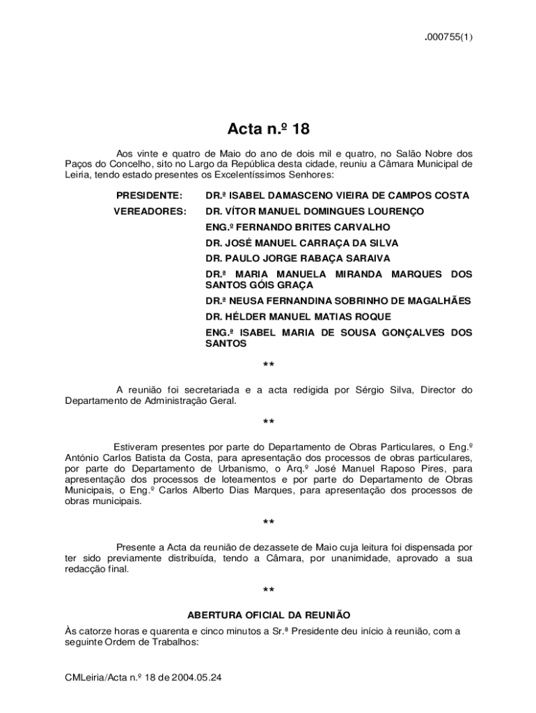 .000755(1)ACTA n. 18 AOS vine e quarto de Main do an ode does mil e quarto, no Sale Noble dos Pass do Concerto, site no Largo the Replica Delta MIDADE, reunion a Clara Municipal de Leiria, tend est