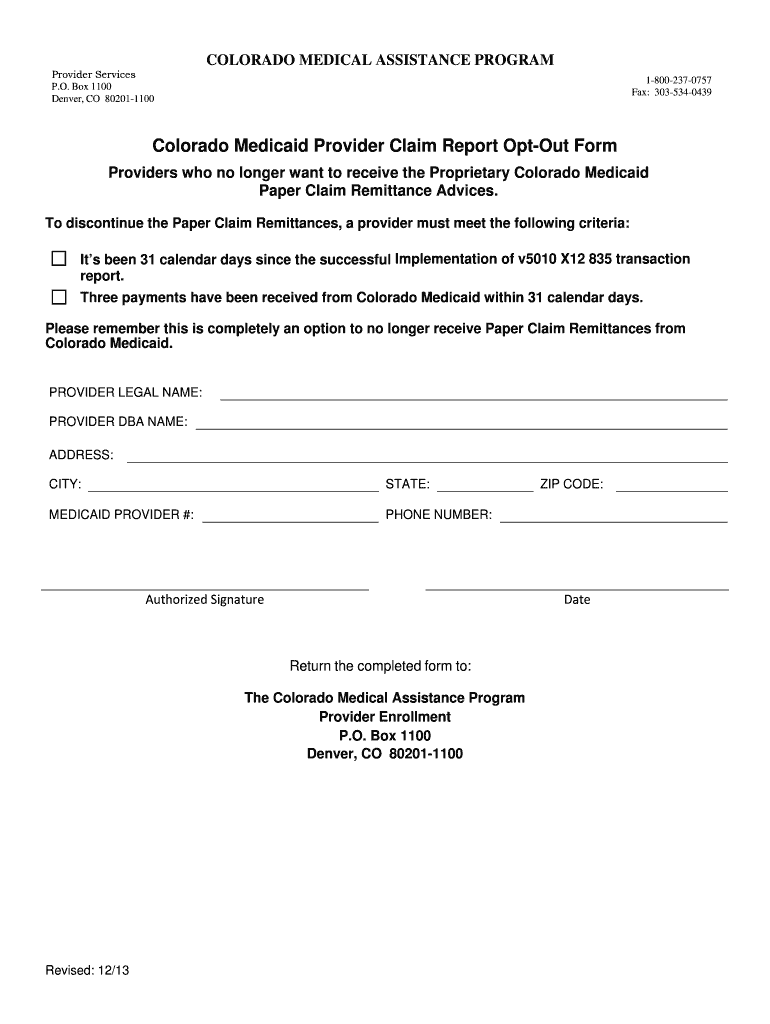 Provider Services P.O. Box 1100 Denver, CO 80201-1100 COLORADO MEDICAL ASSISTANCE PROGRAM 1-800-237-0757 Fax: 303-534-0439 Colorado Medicaid Provider Claim Report Opt-Out Form Providers who no longer