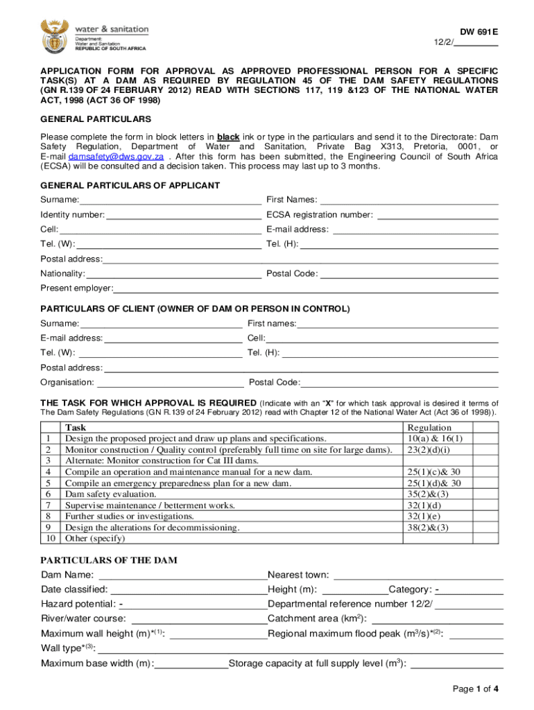 DW 691E 12/2/APPLICATION FORM FOR APPROVAL AS APPROVED PROFESSIONAL PERSON FOR A SPECIFIC TASK(S) AT A DAM AS REQUIRED BY REGULATION 45 OF THE DAM SAFETY REGULATIONS (GN R.139 OF 24 FEBRUARY 2012)