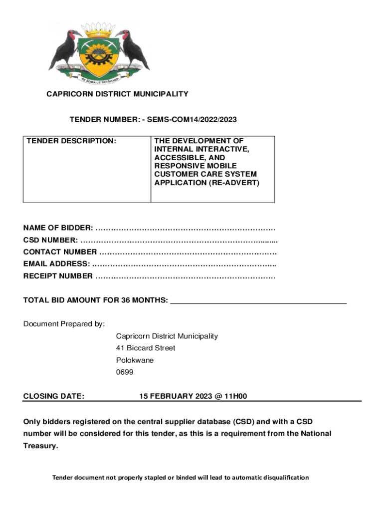 CAPRICORN DISTRICT MUNICIPALITYTENDER NUMBER: SEMSCOM14/2022/2023 TENDER DESCRIPTION:THE DEVELOPMENT OF INTERNAL INTERACTIVE, ACCESSIBLE, AND RESPONSIVE MOBILE CUSTOMER CARE SYSTEM APPLICATION (READERS)NAME