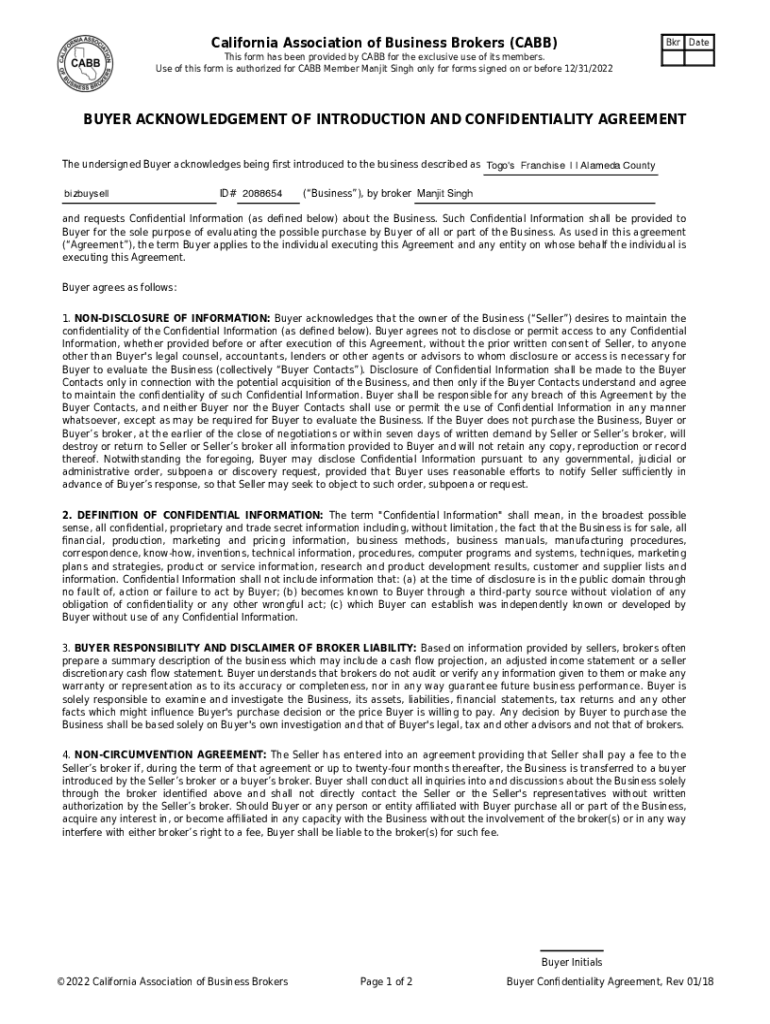 BKR Date This form has been provided by CAB for the exclusive use of its members. Use of this form is authorized for CAB Member Bandit Singh only for forms signed on or before 12/31/2022The undersigned