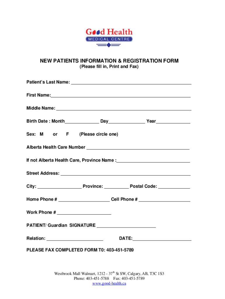 NEW PATIENTS INFORMATION & REGISTRATION FORM (Please fill in, Print and Fax)Patients Last Name: ___ First Name:___ Middle Name: ___ Birth Date : Month___ Day___ Year___ Sex: More(Please circle one)Alberta