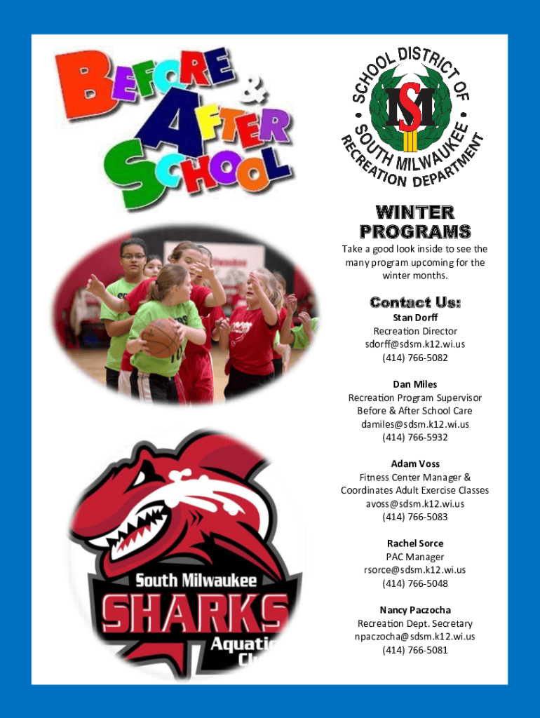 WINTER PROGRAMS Take a good look inside to see the many program upcoming for the winter months. Contact Us: Stan Doff Recreation Director sdorff@sdsm.k12.wi.us (414) 7665082 Dan Miles Recreation Program
