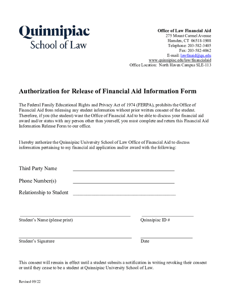 Office of Law Financial Aid275 Mount Carmel Avenue Hamden, CT 065181908 Telephone: 2035823405 Fax: 2035824062 Email: lawfinaid@qu.edu www.quinnipiac.edu/law/financialaid Office Location: North Haven