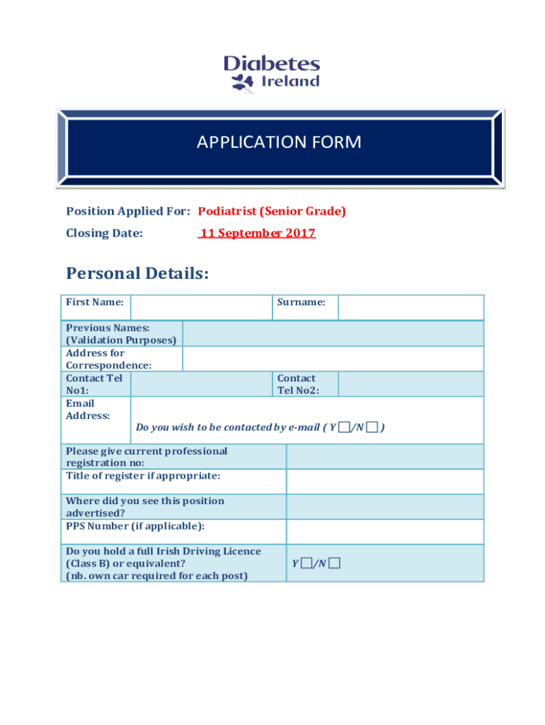 APPLICATION Composition Applied For: Podiatrist (Senior Grade) Closing Date:11 September 2017Personal Details: First Name:Surname:Previous Names: (Validation Purposes) Address for Correspondence: