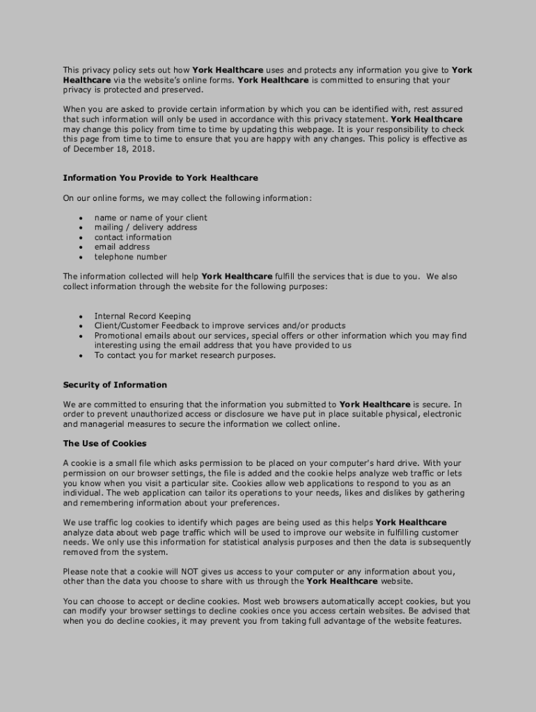 This privacy policy sets out how York Healthcare uses and protects any information you give to York Healthcare via the websites online forms. York Healthcare is committed to ensuring that your privacy