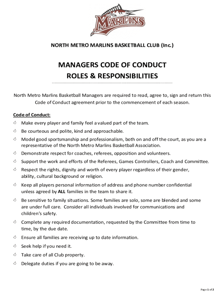 NORTH METRO MARLINS BASKETBALL CLUB (Inc.)MANAGERS CODE OF CONDUCT ROLES & RESPONSIBILITIES ___North Metro Marlins Basketball Managers are required to read, agree to, sign and return this Code of