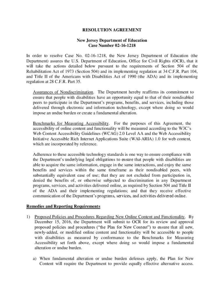RESOLUTION AGREEMENT New Jersey Department of Education Case Number 02161218 In order to resolve Case No. 02161218, the New Jersey Department of Education (the Department) assures the U.S. Department
