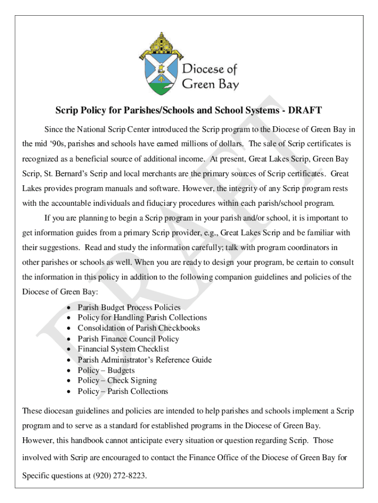 Scrip Policy for Parishes/Schools and School Systems DRAFT Since the National Scrip Center introduced the Scrip program to the Diocese of Green Bay in the mid 90s, parishes and schools have earned