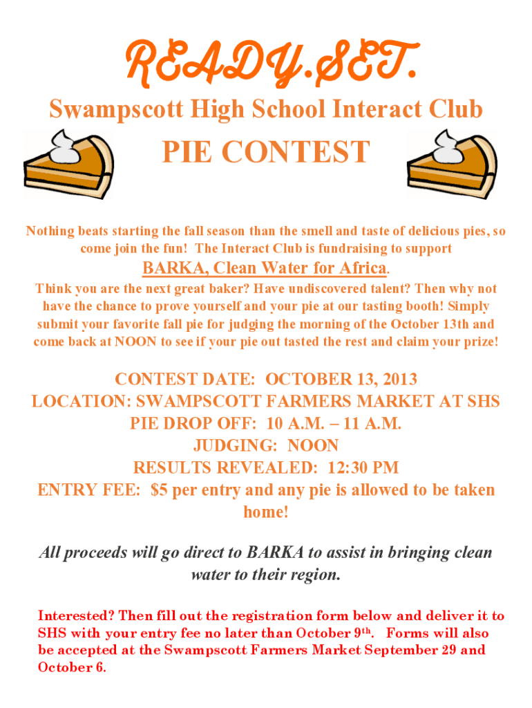 READY.SET. Swampscott High School Interact Club PIE!! PIE CONTESTNothing beats starting fall than the smell and taste of delicious pies, so come join the fun! The Interact Club is fundraising to support
