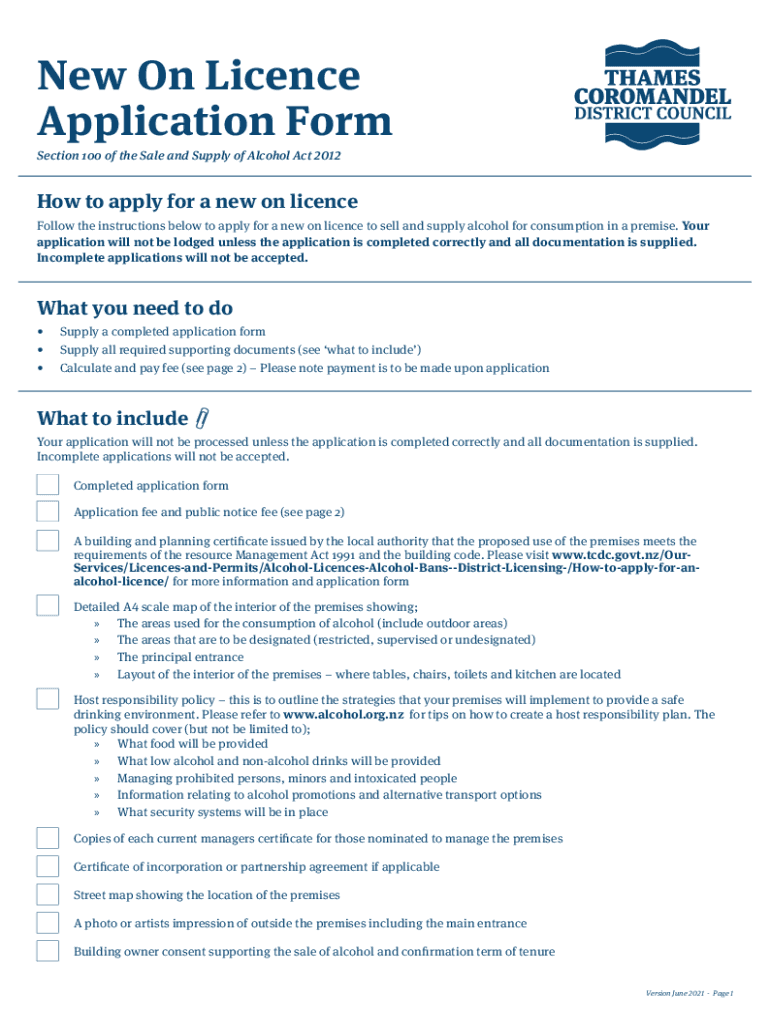 New On License Application Form Section 100 of the Sale and Supply of Alcohol Act 2012How to apply for a new on license Follow the instructions below to apply for a new on license to sell and supply