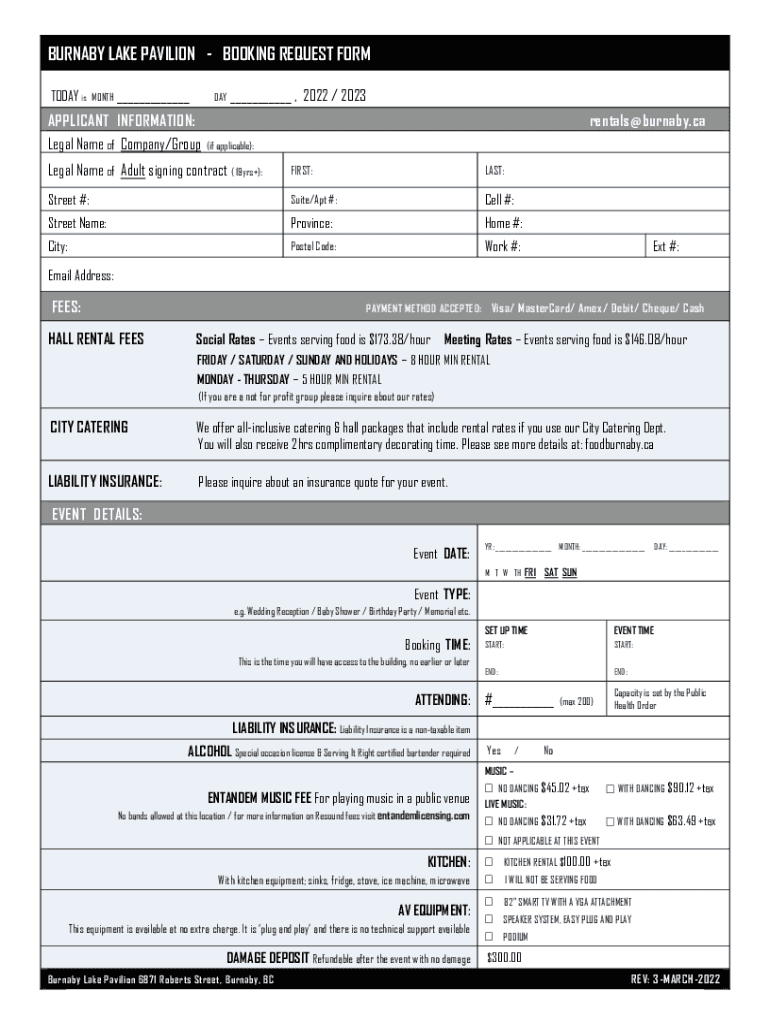 BURNABY LAKE PAVILION BOOKING REQUEST FORM TODAY isMONTH___DAY ___APPLICANT INFORMATION: Legal Name of Company/Group, 2022 / 2023 rentals @ Burnaby.ca(if applicable):Legal Name of Adult signing contract