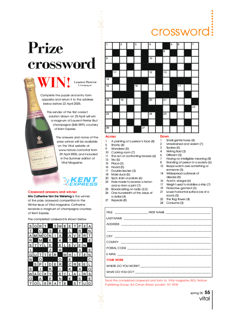 Prize crossword 12345678 91011WIN!121314 15Complete the puzzle and entry form opposite and return it to the address below before 22 April 2005.161817192021 22The sender of the first correct solution