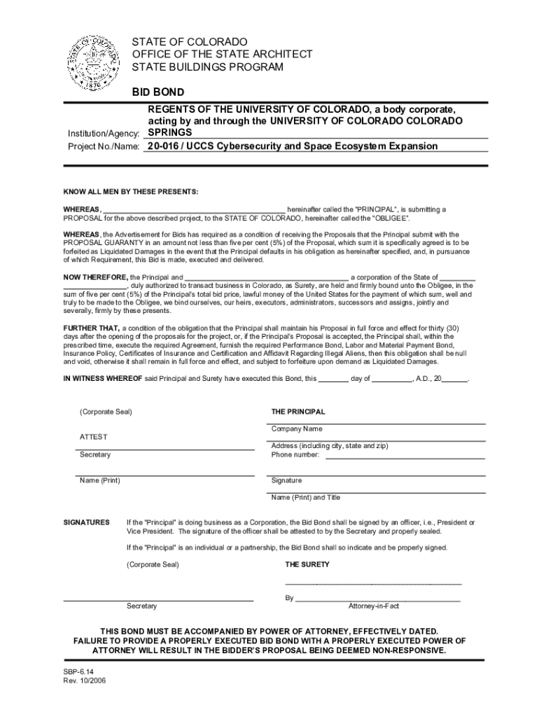 STATE OF COLORADO OFFICE OF THE STATE ARCHITECT STATE BUILDINGS PROGRAM BID BOND REGENTS OF THE UNIVERSITY OF COLORADO, a body corporate, acting by and through the UNIVERSITY OF COLORADO Institution/Agency: