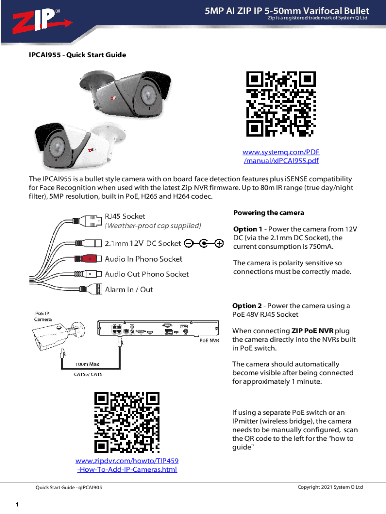 5MP AI ZIP IP 550 mm Varietal Bullet Zip is a registered trademark of System Q LtdIPCAI955 Quick Start Guidewww.systemq.com/PDF /manual/xIPCAI955.pdf The IPCAI955 is a bullet style camera with on