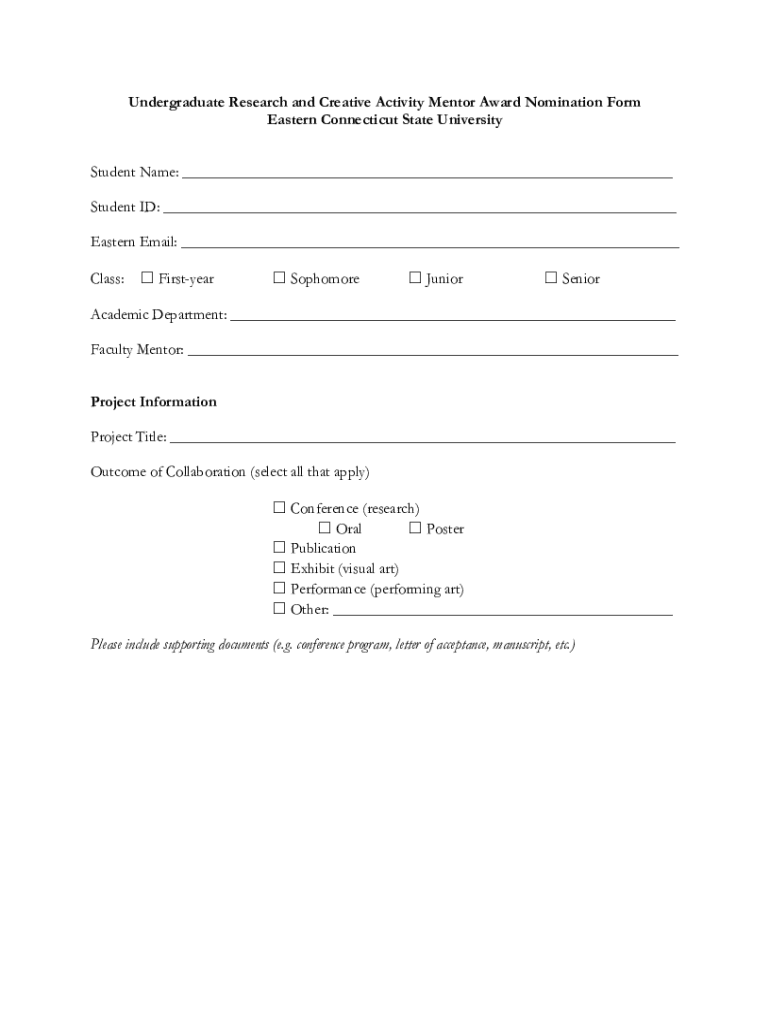 Undergraduate Research and Creative Activity Mentor Award Nomination Form Eastern Connecticut State University The Undergraduate Research and Creative Activity Mentor Award was created to recognize