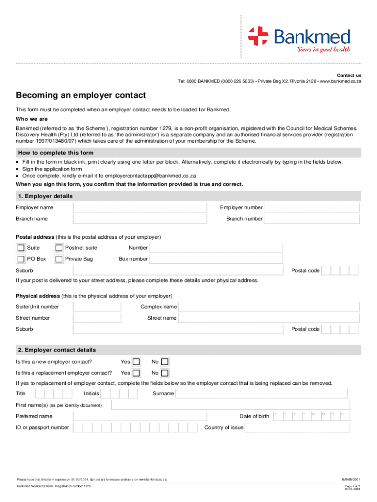 Contact us Tel: 0800 BANKED (0800 226 5633) Private Bag X2, Livonia 2128 www.bankmed.co.zaBecoming an employer contact This form must be completed when an employer contact needs to be loaded for Banked.