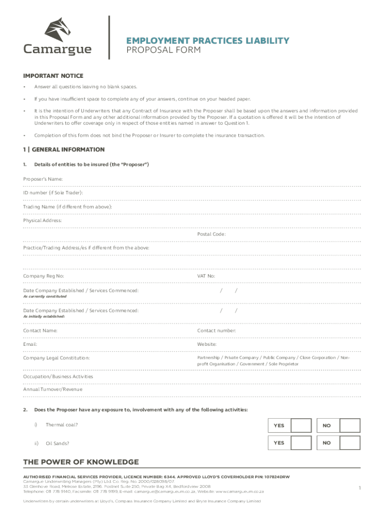 EMPLOYMENT PRACTICES LIABILITY PROPOSAL REEMPLOYMENT PRACTICES LIABILITY PROPOSAL FORMIMPORTANT NOTICE Answer all questions leaving no blank spaces. If you have insufficient space to complete any
