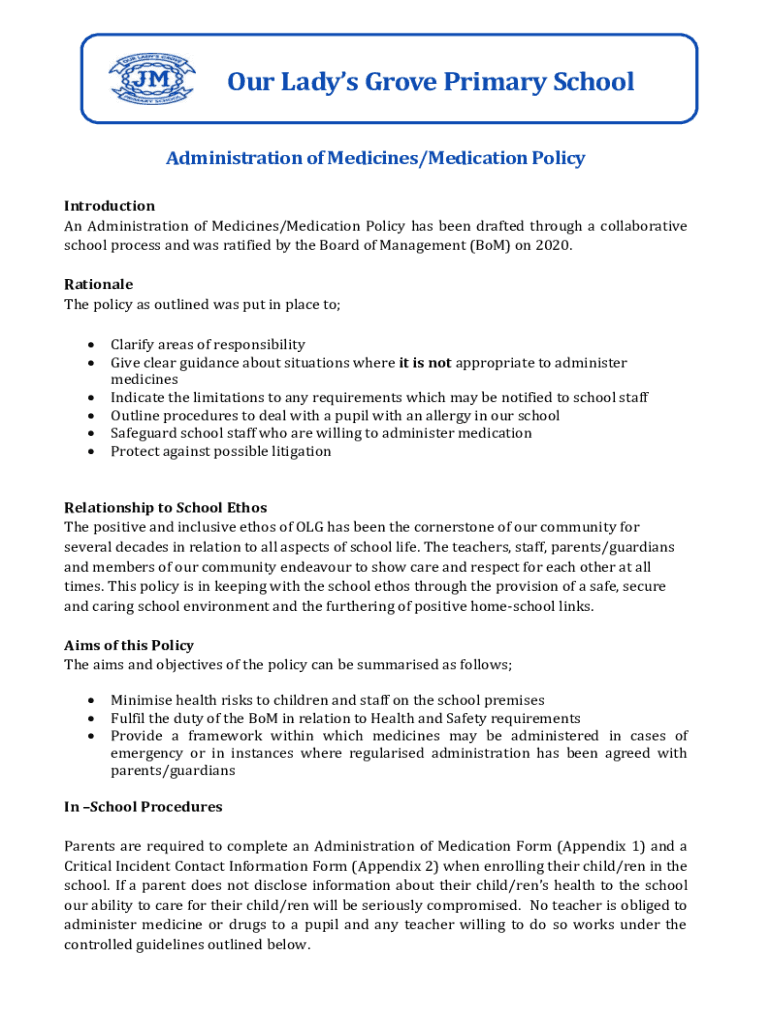 Get the free Administration of Medicines/Medication Policy