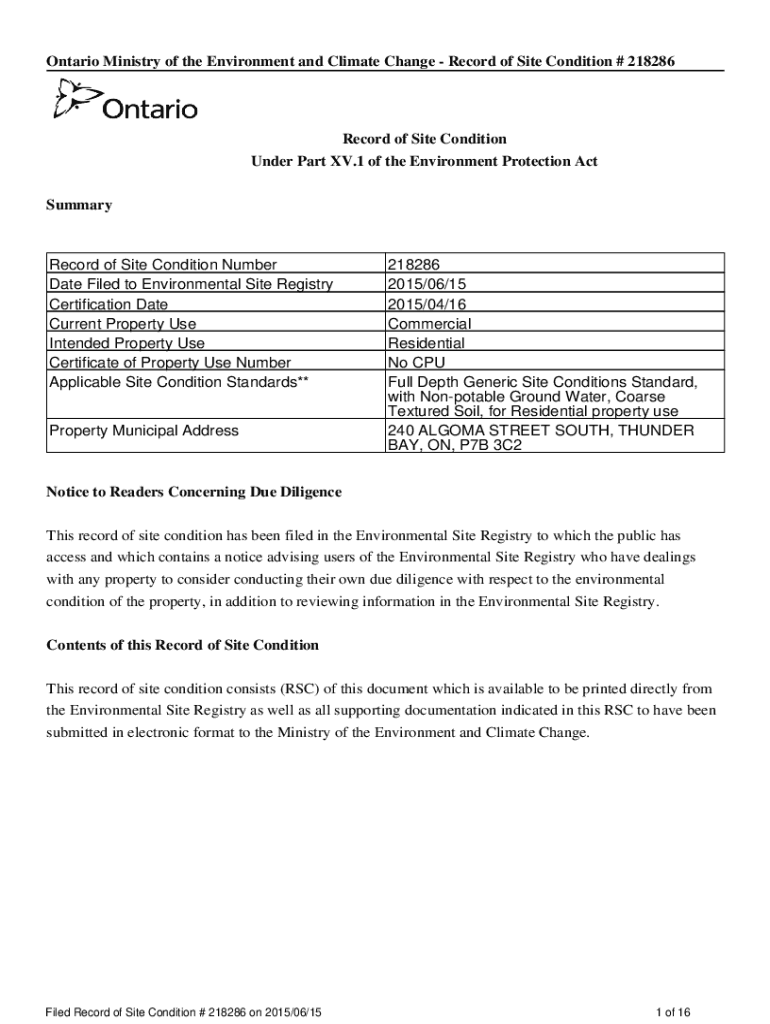 Ontario Ministry of the Environment and Climate Change Record of Site Condition # 218286Record of Site Condition Under Part XV.1 of the Environment Protection Act SummaryRecord of Site Condition Number