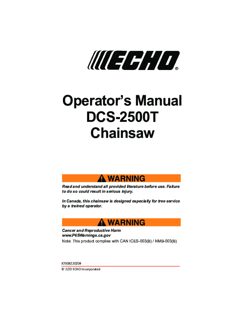 Operators Manual DCS2500T Chainsawed and understand all provided literature before use. Failure to do so could result in serious injury. In Canada, this chainsaw is designed especially for tree service