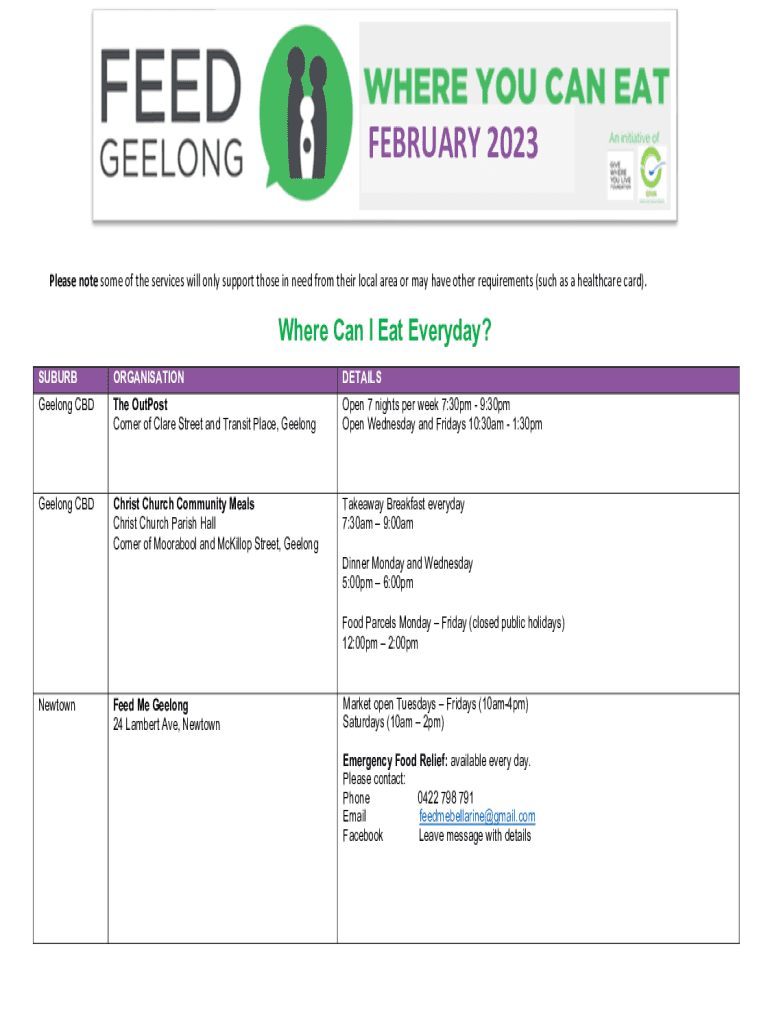 Please note some services will only support those in need from their local area or may have other requirements (such as a healthcare card). Where Can I Eat Every day?