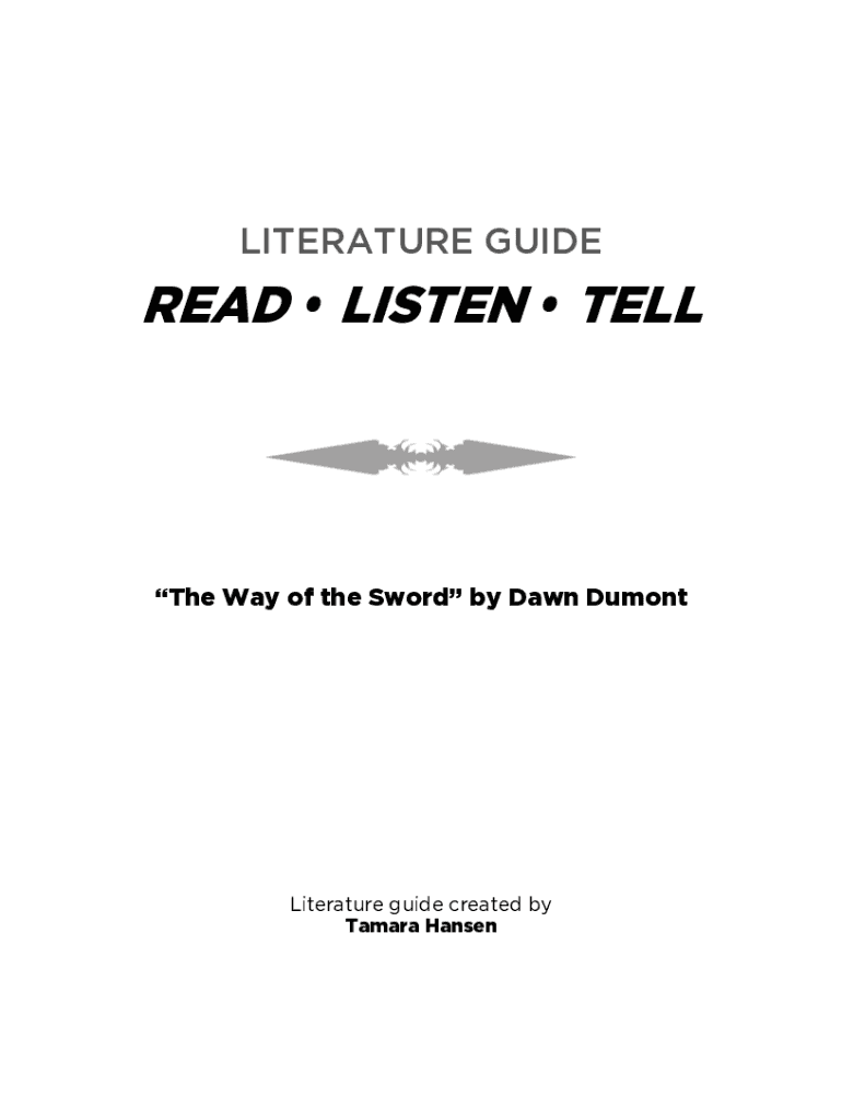 LITERATURE GUIDER EAD LISTEN Telltale Way of the Sword by Dawn DumontLiterature guide created by Tamara HansenLiterature Guide: The Way of the Sword2\” The Way of the Sword\” by Dawn Dumont Read,