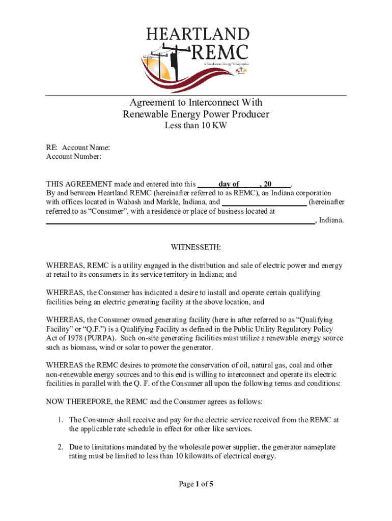 Agreement to Interconnect With Renewable Energy Power Producer Less than 10 KW RE: Account Name: Account Number: THIS AGREEMENT made and entered into this day of, 20. By and between Heartland REM