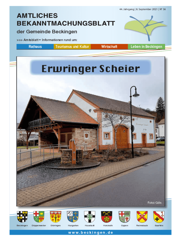 BEKANNTMACHUNGSBLATT44. Charging | 8. September 2021 | N 36der Demand Backing Amtsblatt Informationen round um:RathausTourismus UND KulturWirtschaftLeben in BeckingenErwringer ScheierFoto:
