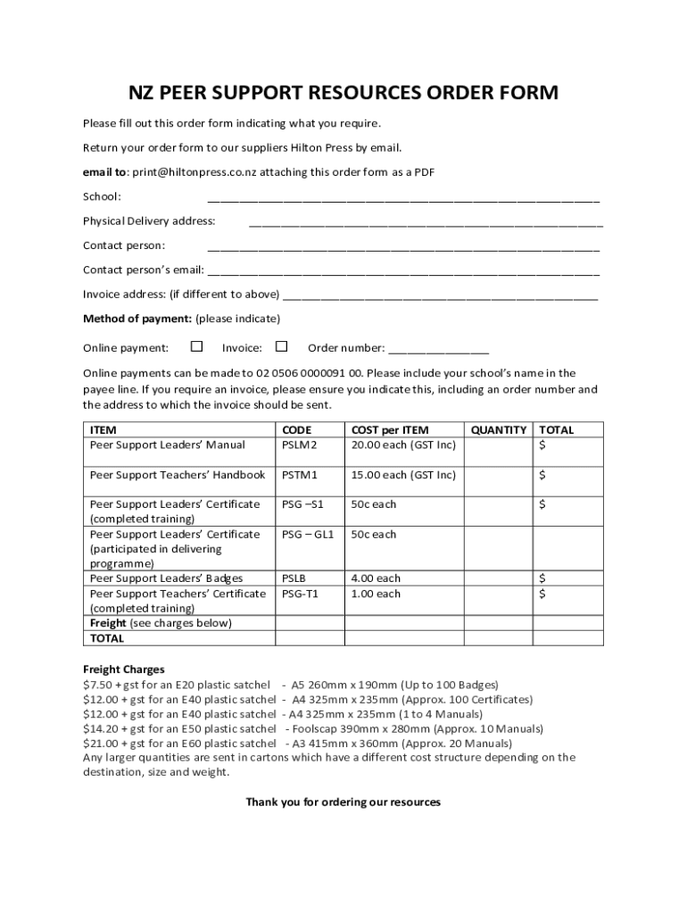 NZ PEER SUPPORT RESOURCES ORDER FORM Please fill out this order form indicating what you require. Return your order form to our suppliers Hilton Press by email. Email to: print@hiltonpress.co.nz attaching
